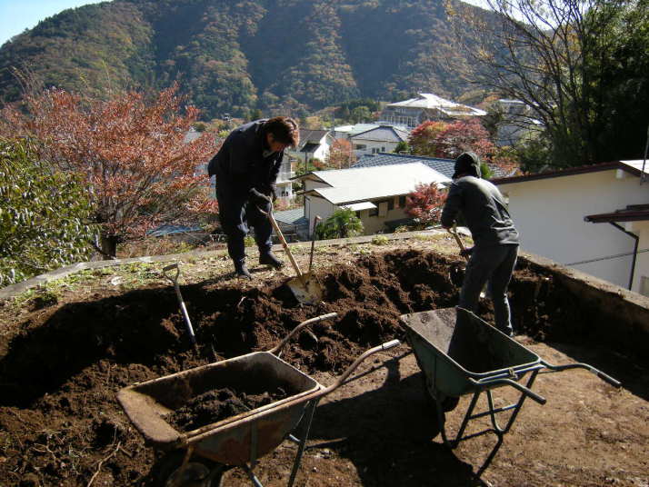 - 添付画像の土砂の搬出は、一輪車で行いました。
